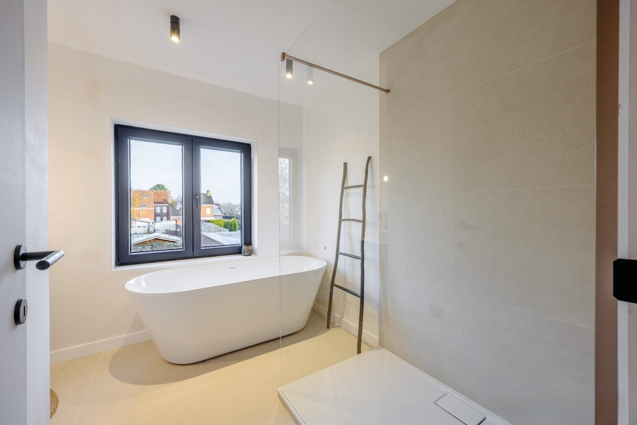 1e verdieping omvat een nachthal met 2 ruime slaapkamers (24,90 m²; 11,90 m²) waarvan 1 master bedroom met mogelijkheid tot ensuite dressing en fantastisch geïnstalleerde badkamer met ligbad, inloopdouche en wastafel met apart toilet en wasberging.